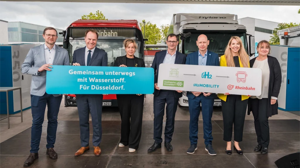 Martin Jüngel, Managing Director and CFO, H2 MOBILITY, Dr Stephan Keller, Lord Mayor of the City of Düsseldorf, Mona Neubaur, Minister for Economic Affairs, Industry, Climate Action and Energy of the State of North Rhine-Westphalia and Deputy Premier of North Rhine-Westphalia, Julien Mounier, Chairman of the Board of Stadtwerke Düsseldorf, Stadtwerke Düsseldorf, Frank Fronzke, Managing Director and Chief Operating Officer COO, H2 MOBILITY, Annette Grabbe, Member of the Executive Board, Rheinbahn, Dagmar Fehler, Spokesperson and CEO, NOW GmbH. (Image: H2 MOBILITY)