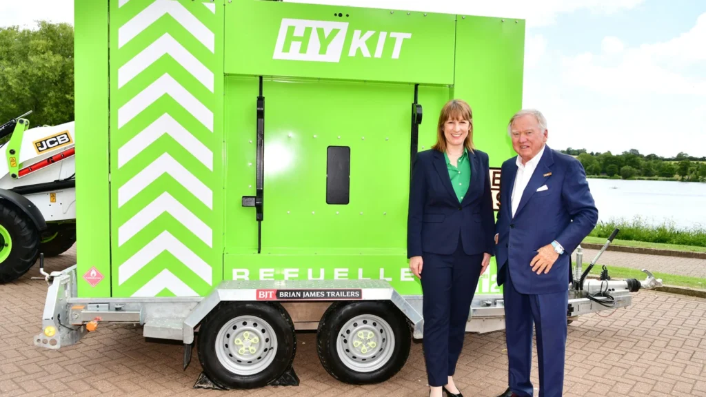 Chancellor Rachel Reeves stands with Lord Bamford next to JCB’s HyKit mobile hydrogen refueller. (Image: JCB)