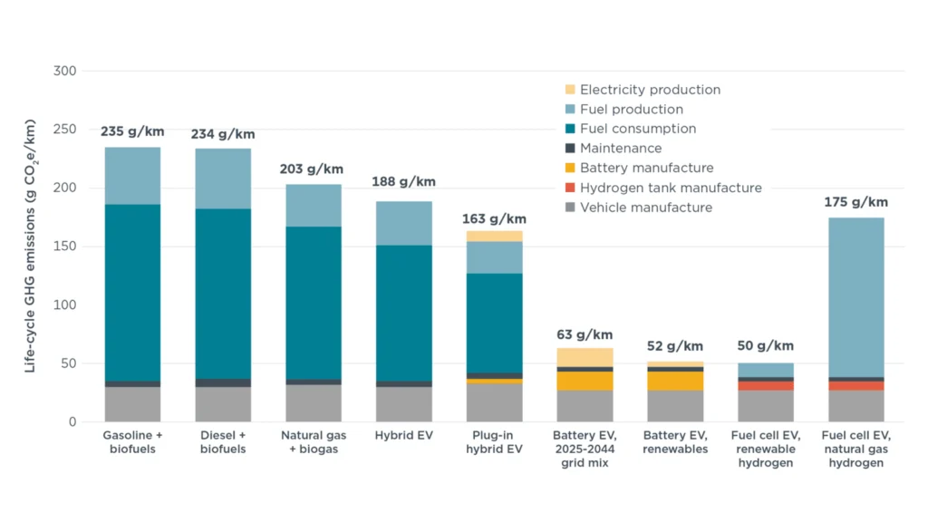 It adds up the total climate impact of each vehicle type across a full 20-year, 240,000 km life – including fuel production, vehicle manufacturing, battery or fuel cell production, tailpipe emissions, electricity or hydrogen supply, and recycling.